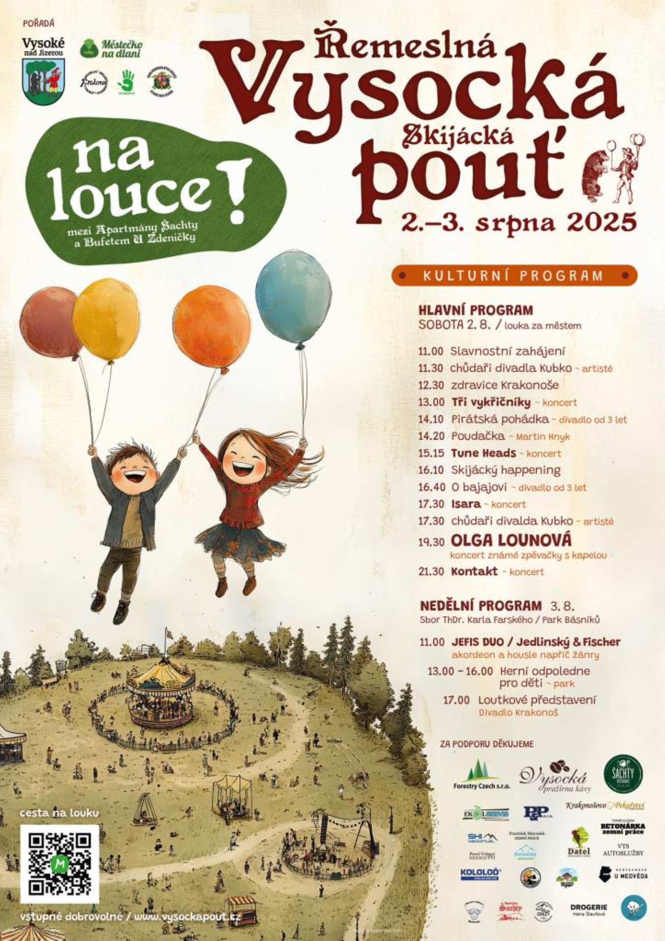 Víkend plný zábavy, hudby a tradic nabídne Řemeslná Vysocká pouť, která se uskuteční 2.–3. srpna 2025 na louce za městem Vysoké nad Jizerou, mezi Apartmány Šachty a Bufetem U Zdeničky. Akce propojuje lidovou zábavu s bohatým kulturním programem pro děti i dospělé.
